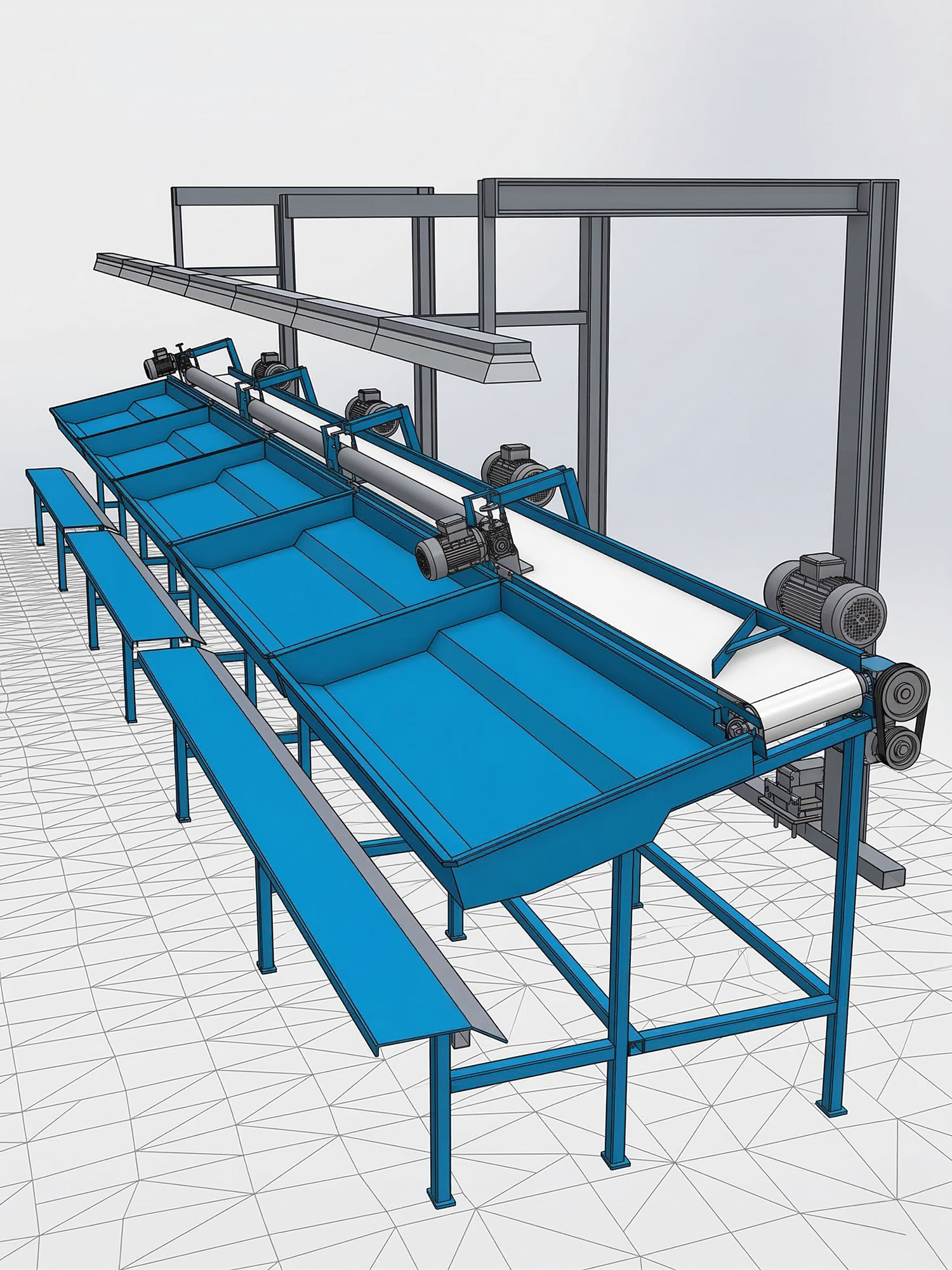 Custom Παραμετροποίηση: Το μέγεθος του μηχανήματος προσαρμόζεται πλήρως στις ανάγκες της δικής σας παραγωγής, με δυνατότητα σχεδιασμού από 1 έως και 9 εξόδους (δρόμους) ταξινόμησης.